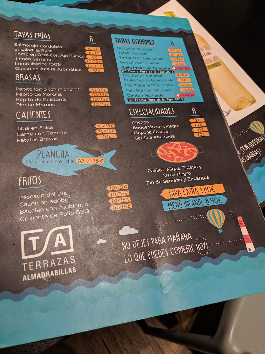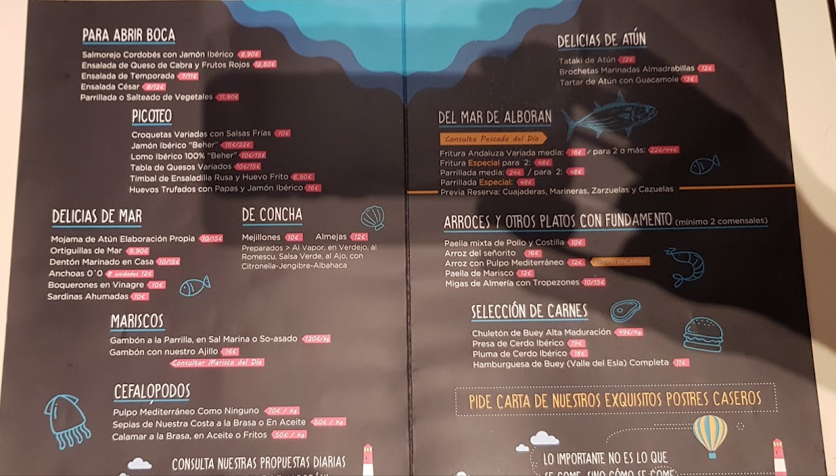 The menu at Terrazas Almadrabillas offers a variety of dishes primarily rooted in Mediterranean cuisine, complemented by bar and grill options as well as coffee shop selections. It is designed to accommodate different dining occasions, from coffee breaks to light meals and more substantial orders.